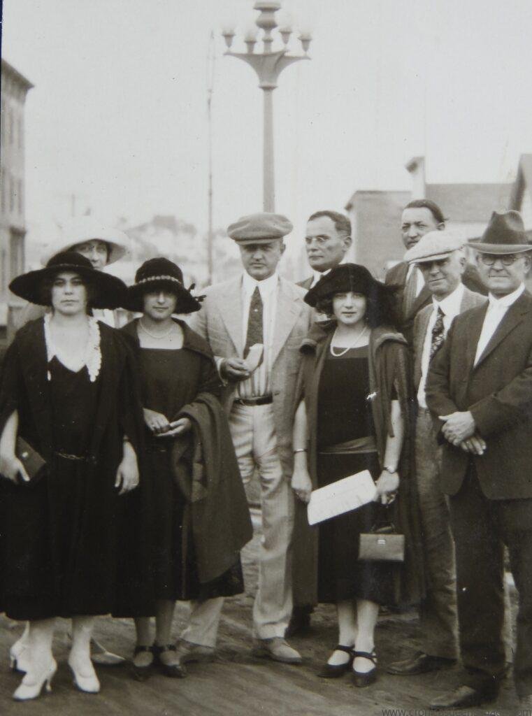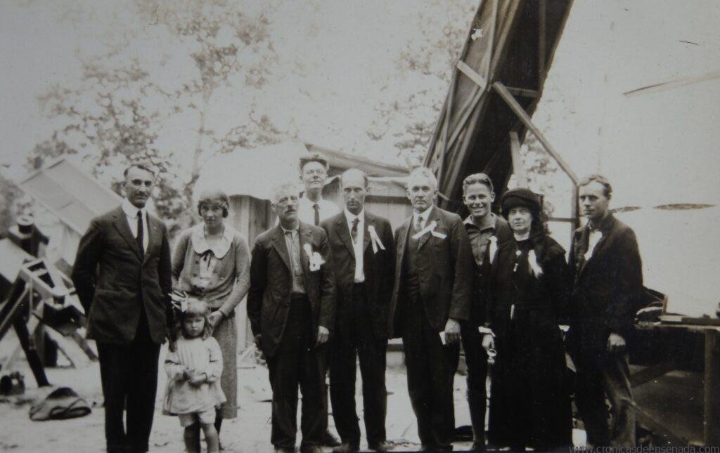 Grupo de científicos que acudieron a estudiar el eclipse en Ensenada, posan junto al telescopio principal que fue instalado en un lugar arbolado de Ensenada, conocido como Valle Verde. Varios de ellos se identifican con un listón blanco que está sujeto a la ropa en la parte izquierda del pecho.