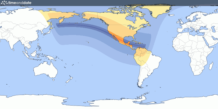 Esta imagen muestra la trayectoria global del eclipse total de sol y los lugares en donde se le pudo observar en su totalidad. Imagen de timeanddate.com.