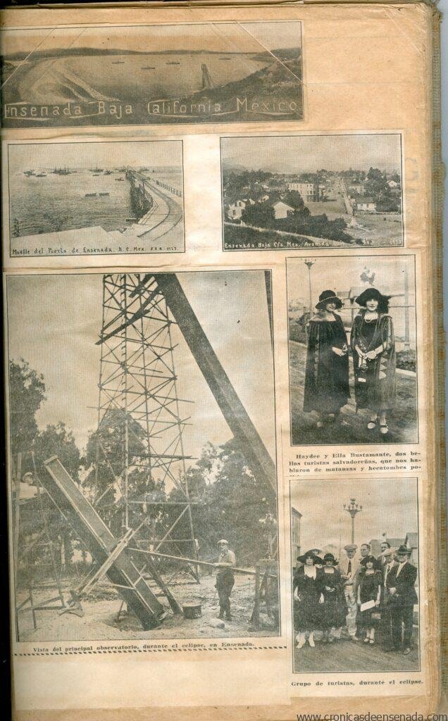 Imagen de Portada: Esta fotografía le fue tomada a un grupo de personas, entre las cuales se encuentran astrónomos que documentan el eclipse con el uso de un pequeño telescopio y a una persona sentada que toma nota con la ayuda de una máquina de escribir. Nótese el listón blanco que tiene en la camisa y que es distintivo del grupo de científicos que acudió a estudiar el fenómeno astronómico en el puerto de Ensenada. Junto a él esta montado en una motocicleta otro miembro del grupo. La fotografía fue tomada en las afueras de la famosa cantina Hussong, por cierto, esta imagen era la única que se conocía sobre el eclipse observado en Ensenada. Se desconoce al autor de la foto.